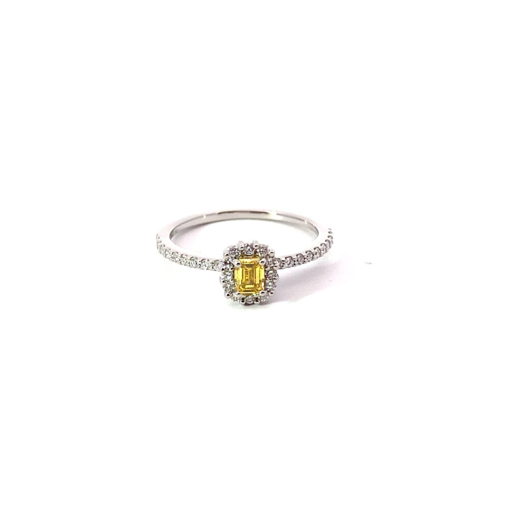 こちらのリングは、太陽の光を閉じ込めたような美しいFancy Vivid Yellowが特徴のエメラルドカットのカラーダイヤモンドに、上質なホワイトダイヤをぐるりとあしらったラグジュアリーな一点物。